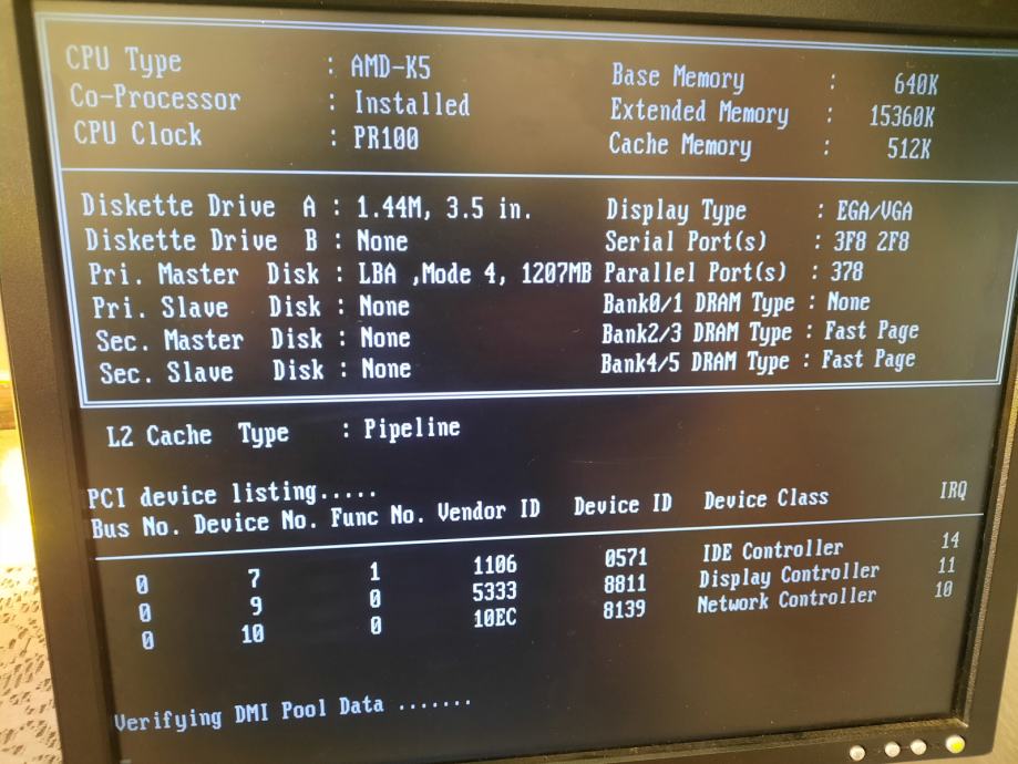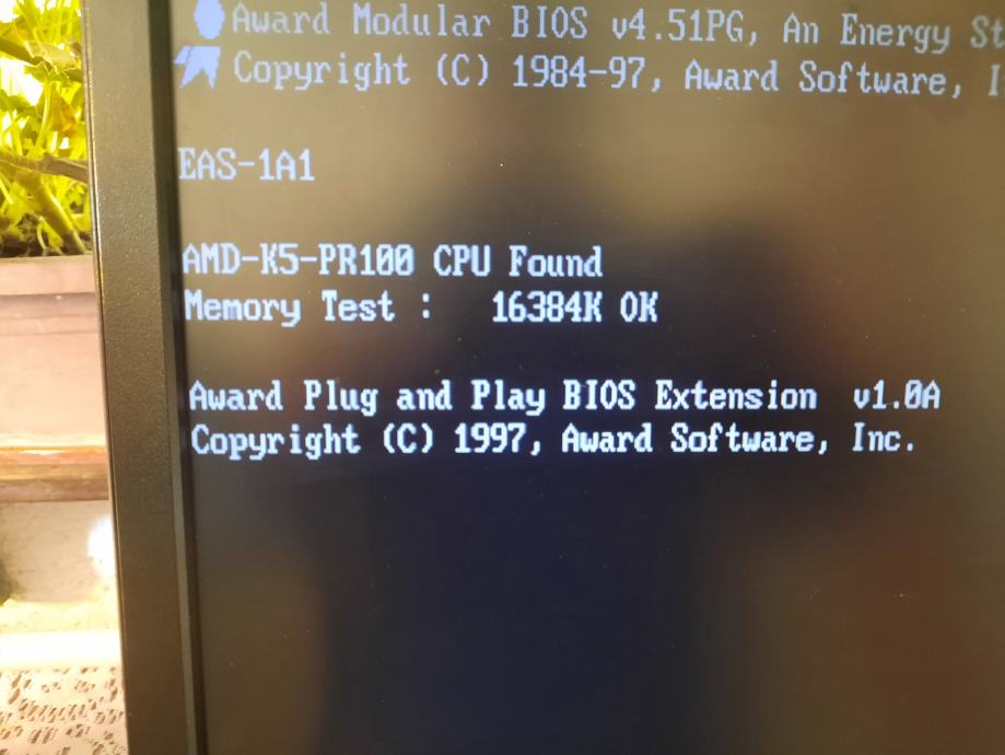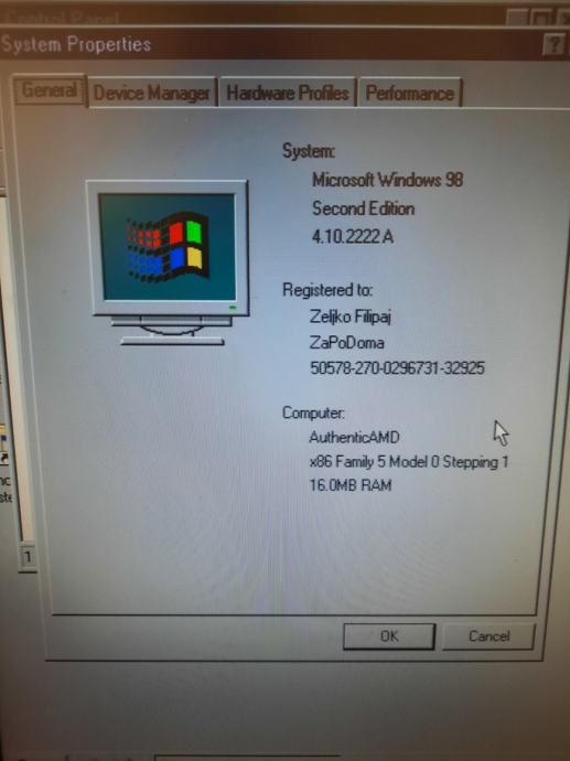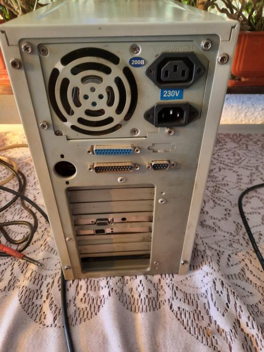 Stari komp, amd k5 socket 7, s3 trio grafa, 16 mb rama i 1.2 gb disk. Sve radi.