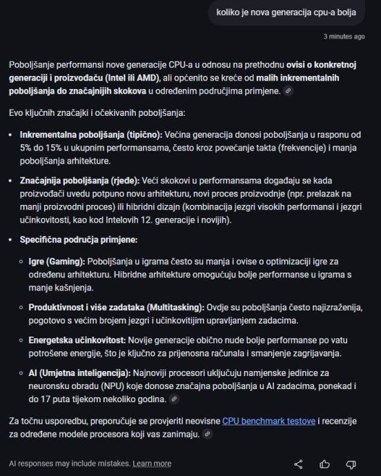 Složeno od biranih komponenti i sasvim dobar Pc (pitajte ai- koliko je nova generacija cpu-a bolja..(zadnja slika) max15% i to je nemoguće čak i ako je arhitektura najnovija jer pričam o istom clock-u(taktu)), sve je ostalo isto već godinama, jezgre su jezgre, clock je clock, cash je cash itd..nema većeg znatnijeg pomaka..