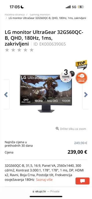 1. monitor-LG UltraGear 32GS60QC-B gaming monitor, star 3 mjeseca i pod garancijom, nudi QHD rezoluciju (2560x1440), osvježavanje od 180Hz i odzivno vrijeme od 1ms (GtG). Posjeduje zakrivljeni VA panel s kontrastom 3.000:1, svjetlinosću 300 cd/m² i podršku za HDMI, DisplayPort te ravni crni dizajn. Idealan za gaming s izvrsnom kvalitetom slike i performansom. Monitor ima 2k rezoluciju-plaćen 220eura,ima garanciju star 3mj
