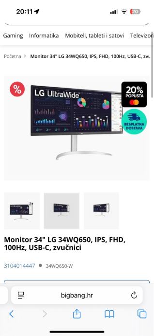 2. monitor- LG UltraWide 34WQ650 monitor kupljen prije 3 mjeseca u Big Bang-u, korišten svega 5 sati, u izvrsnom stanju s punom garancijom. Ima IPS panel, FHD rezoluciju, 100Hz osvježavanje i USB-C priključak plaćen 220 eura