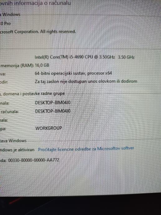 OS: Windows 10 Pro, sa Office programom, sve na hrvatskom jeziku.