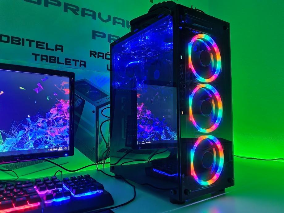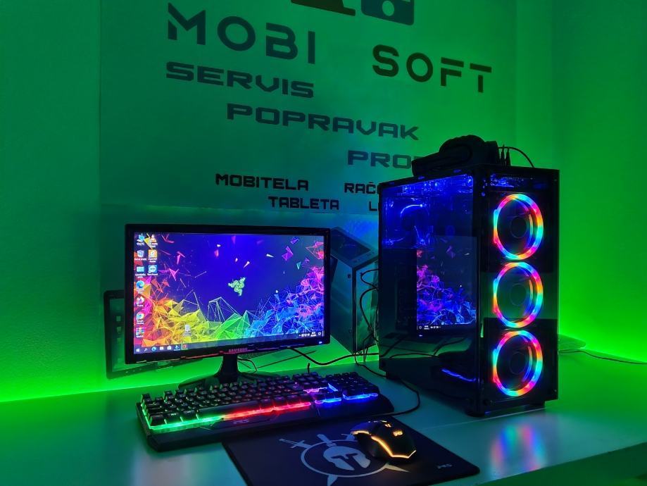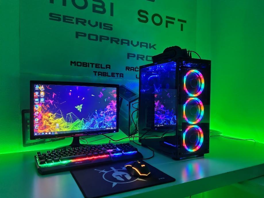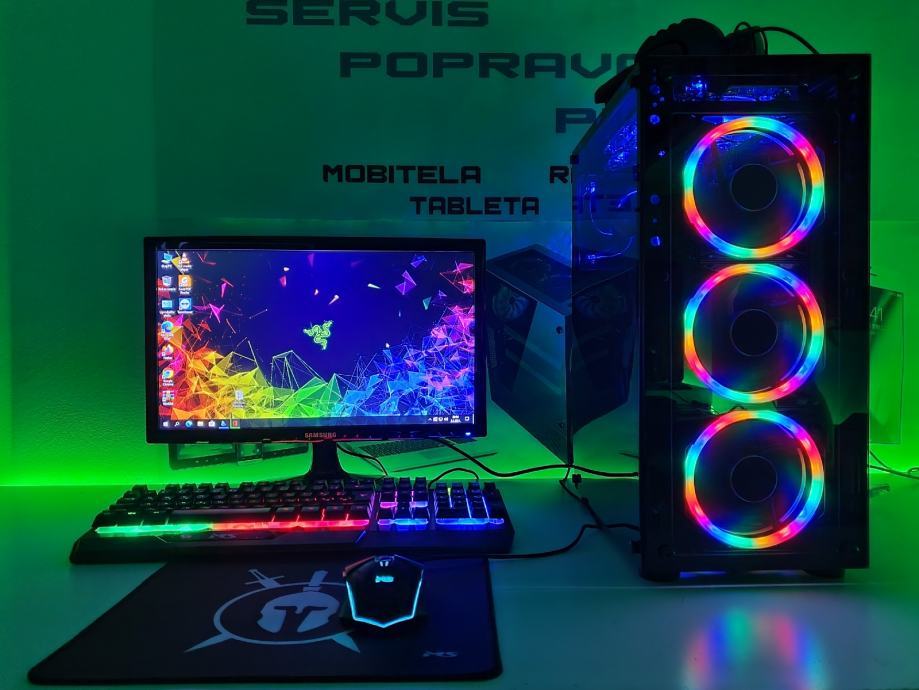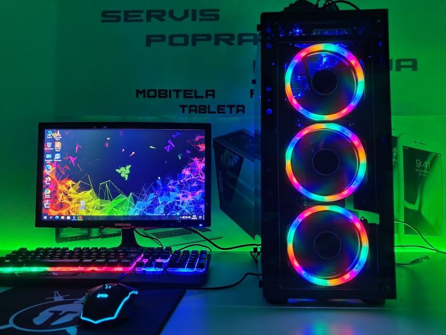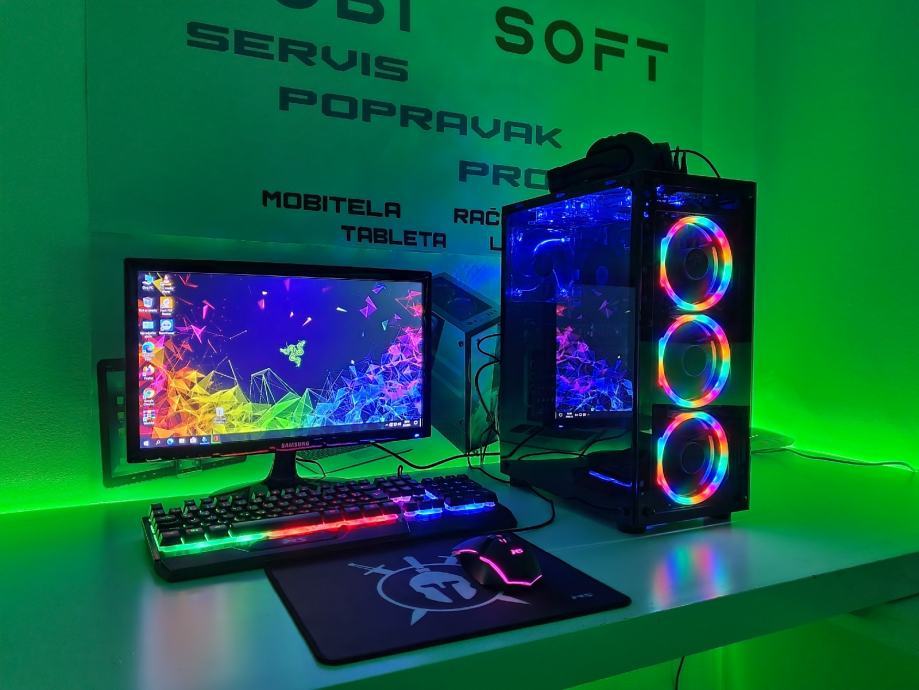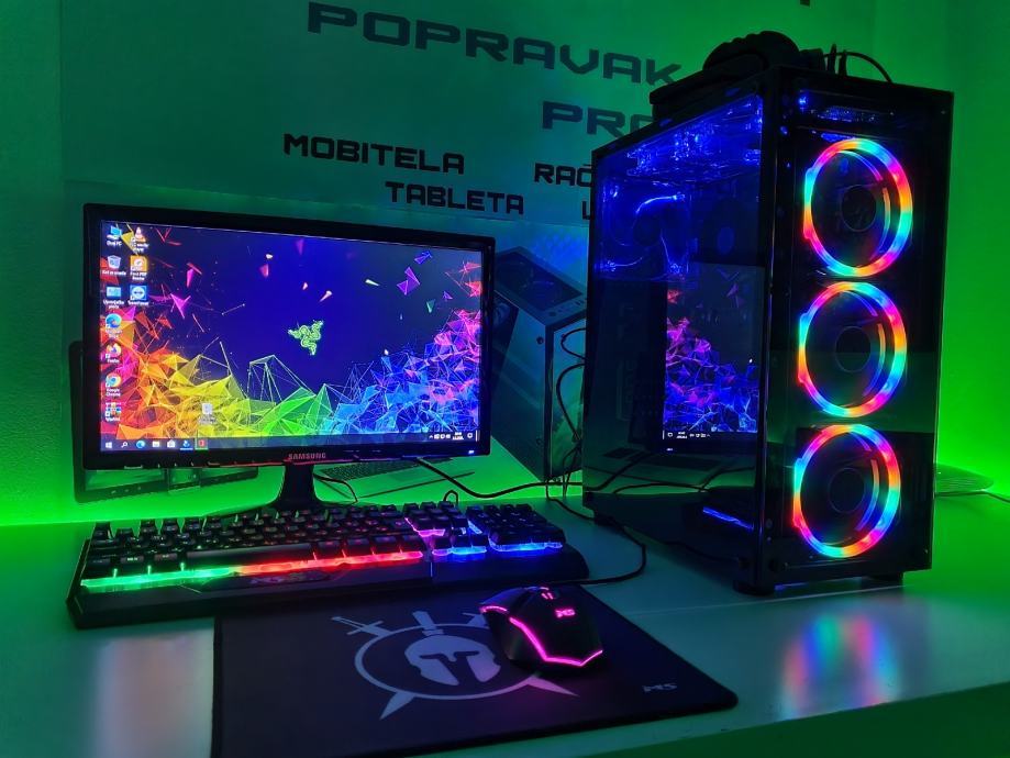 Gaming PC dolazi sa svim u kompletu što uključuje RGB kučište sa 6 ventilatora, LED monitor Samsung 19", tipkovnica, mis, slusalice i podloga MS koji su također RGB.
