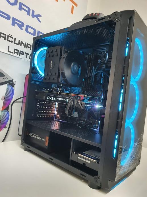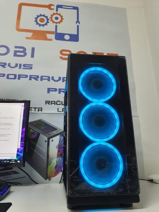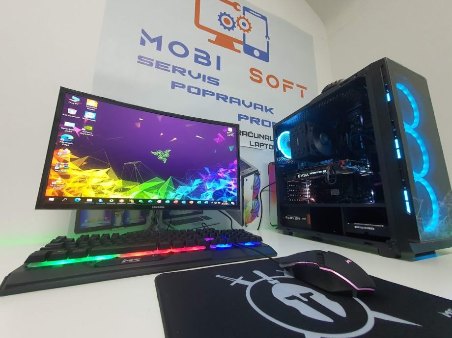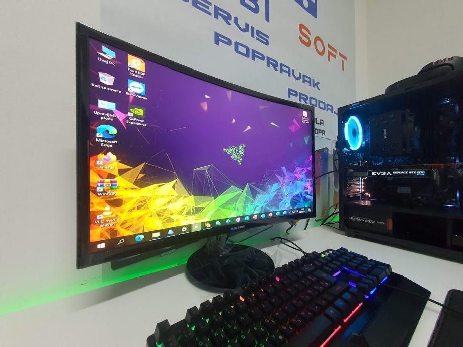 Gaming PC dolazi sa svim u kompletu što uključuje RGB kućište na kojem možete mijenjati boje te upravljati brzinom ventilatora, monitor Samsung zakrivljeni od 24" koji možete podesiti na visinu i nagib, vrhunske kvalitete odaziva slike, tipkovnica, miš, slušalice i podloga MS koji su također RGB.