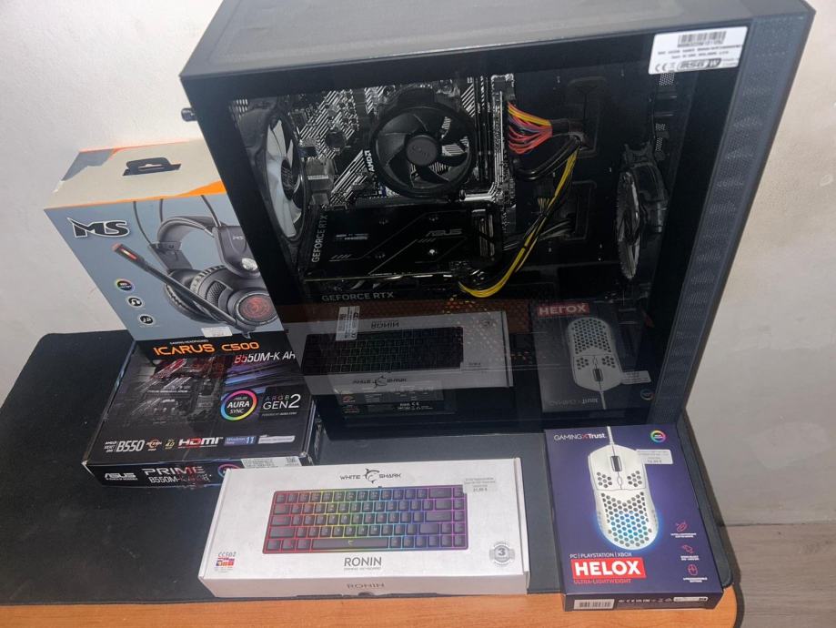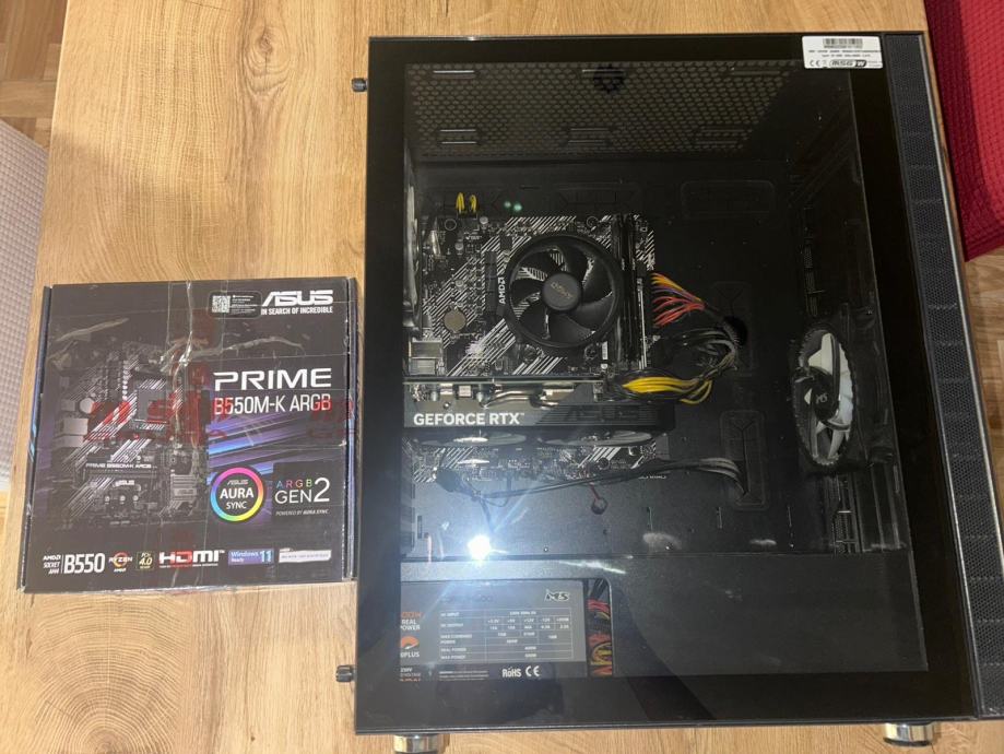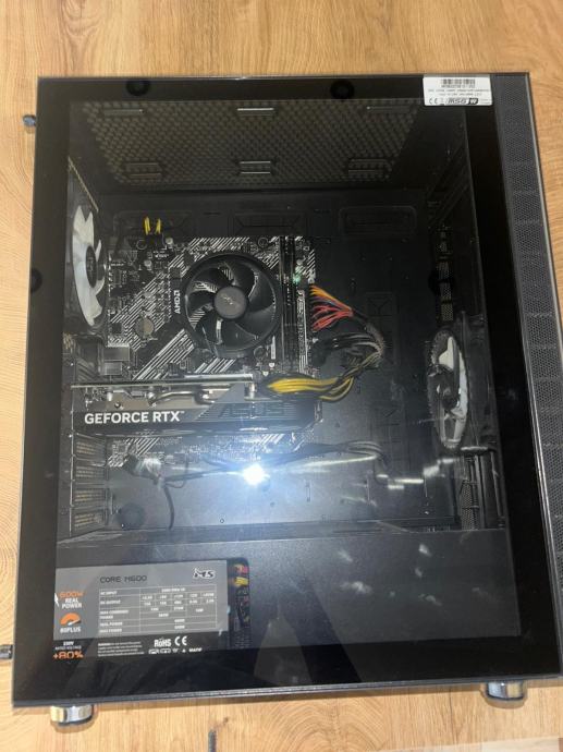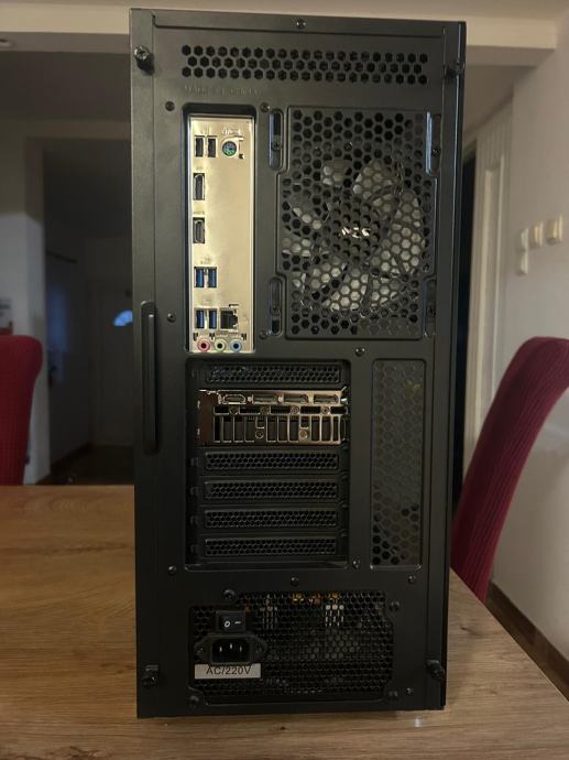 Prodajem gaming PC u crnom MSI kućištu s prozirnom bočnom stranicom. Unutra se nalazi AMD procesor na 3.6 GHz, 16 GB RAM-a, 1 TB tvrdi disk te Nvidia GeForce RTX grafička kartica. Matična ploča je ASUS Prime B550 serije. Napajanje je Core M600 s 80+ certifikatom.