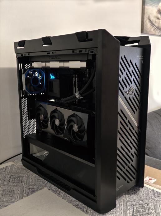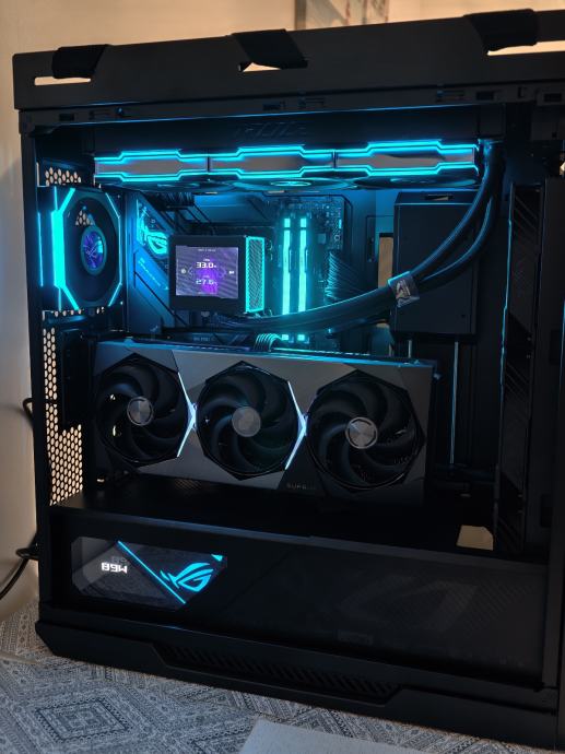 - Rog Ryujin III 360 ARGB vodeno hladenje sa zamjenim ventilatorima te stavljen Lian Li TL 120mm Wirelles ( jace hlade ) . Takoder je postavljen pozadi Wirelles LCD Lian li