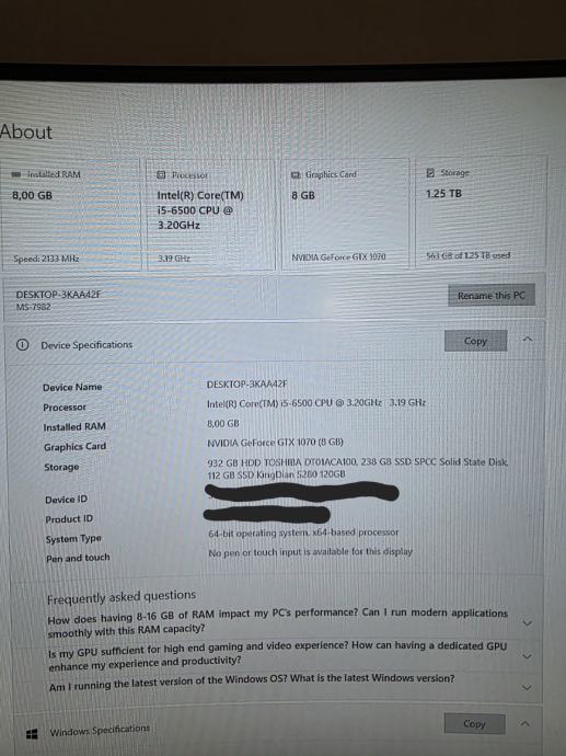 Prodajem gaming računalo u bijelo-crnom kućištu Zalman Z9. Računalo ima Intel Core i5-6500 procesor s 4 jezgre koji radi na 3.20GHz, 8GB DDR4 RAM memorije i NVIDIA GeForce GTX 1070 grafičku karticu. 932 GB HDD TOSHIBA DT01ACA100, 238 GB SSD SPCC Solid State Disk 112 GB SSD KingDian S280 120GB