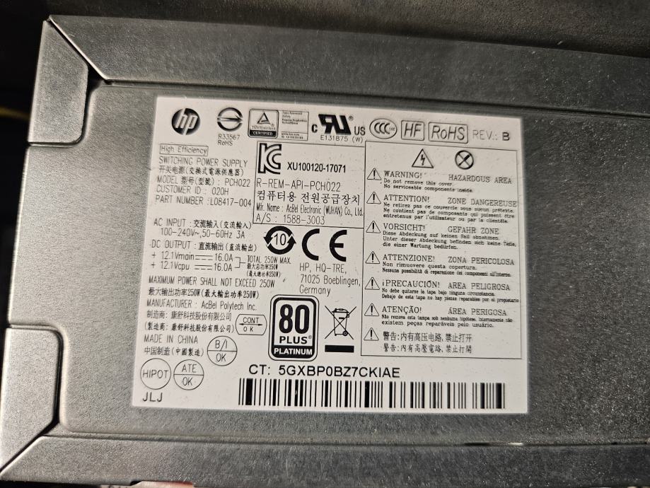 80 PLUS PLATINUM - Napajanje izuzetno učinkovito jer pretvara preko 90% struje iz utičnice u korisnu energiju za komponente, što je tipično za ovaj HP model.