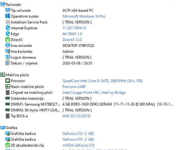 Intel i5 3470 (3,4 GHz), Foxconn 2ABF maticna ploca, 5 Gb RAMa, graficka nvidia geforce 210 (1Gb), 500 + 500 Gb HDD