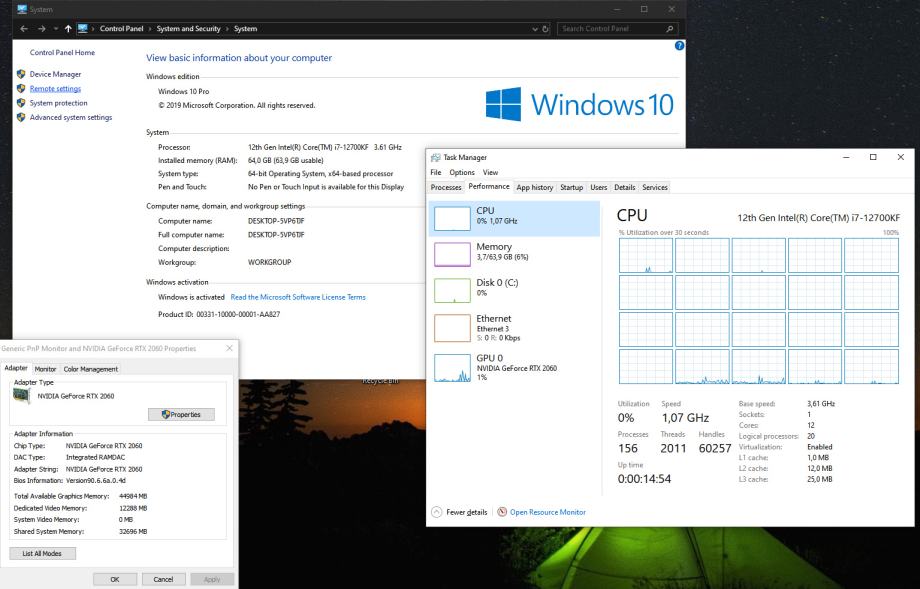 i7-12700KF (20 thread, 5 GHZ), 64Gb RAM, Nvidia RTX 2060 12Gb VRAM (!)