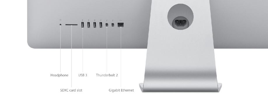 4 x USB 3.0 ports, dual Thunderbolt 2 ports, Gigabit Ethernet, 802.11ac Wi-Fi (802.11a/b/g/n compatible), and Bluetooth 4.0