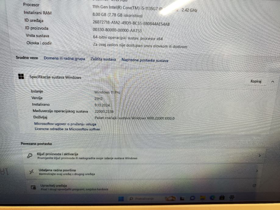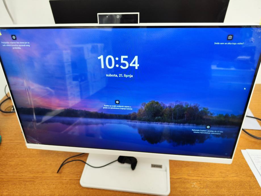 24" ekran. Računalo jako malo korišteno jos je folija na ekranu. Ima Bt, wifi i kamera u sebi. WINDOWS 11 Pro licenca.