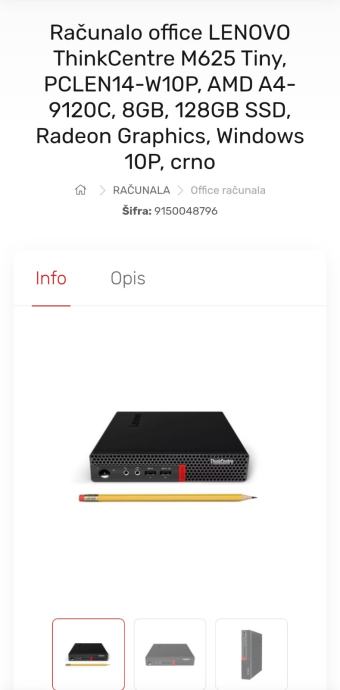 Lenovo mini pc m625q napisao sam rabljeno jer nije vise u trgovini ali nije rabljen vise isproban samo .comp vrlo malih dimenzija u kutiji originalna ambalaža i jamstvo opis komponenata na slici 0998749372 samo racunalo ali mogucnost i kompleta ako je potrebno s monitorom 22 inca tipkovnica mis cijena veca onda