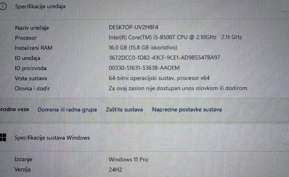 Prodajem Lenovo ThinkCentre M920Q Tiny, kompaktan mini PC pogodan za svakodnevno korištenje. Opremljen je Intel Core i5-8500T procesorom koji radi na 2,10 GHz, 16 GB RAM-a te 512 GB SSD-om. Na računalu je instaliran Windows 11 Pro (verzija 24H2), spreman za korištenje.