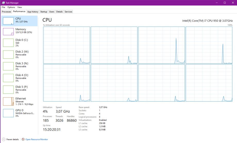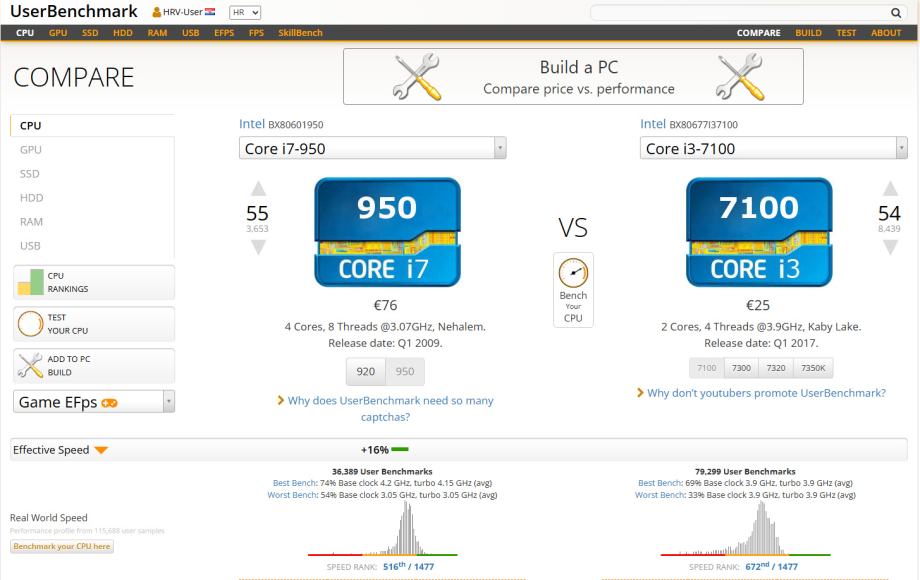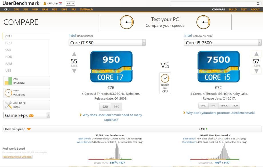 Procesor: 4-jezgreni Intel I7-950 (za komparaciju - jednako brz kao i5-7500, cca. 15% brži od i3-7100)