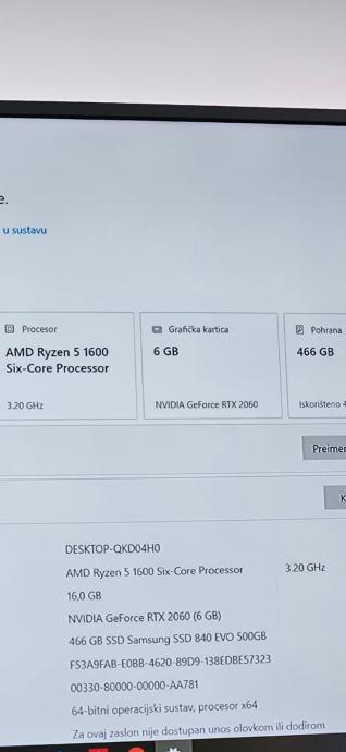 Procesor je Ryzen 5 1600 sa 6 jezgri i 12 threads, grafička kartica RTX 2060 i ima 6GB, ima i SSD od 500gb od Samsunga, te 16GB DDR4 memorije. Sve to složeno u lijepom kučištu sa led ventilatorom. Ima instalirane Windowse i može se odmah koristiti bez problema. Komp je jako brz i ne šteka ništa.