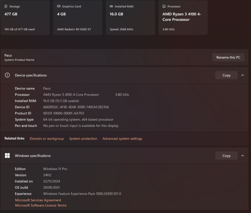 - Graficka kartica: AMD Radeon RX 6500 XT, 4GB GDDR6