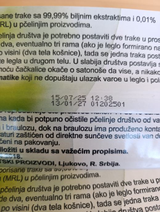 Svježa pakiranja datum proizvodnje 29.07.2025. godine , ne kupujte stare zalihe pred istek roka trajanja samo ćete baciti novce. Pojavile su se na tržištu i kopije lijeka koje nisu učinkovite, kupujte provjereno i sigurno, pčele će vam biti zahvalne i jake.
