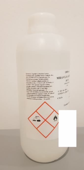 Naime, ako raspolažemo sa komercijalnim pakovanjem 85% mravlje kiseline, to znači da se u 100 grama 85% rastvora nalazi 85 grama iste mravlje kiseline. 60% mravlju kiselinu ćemo dobiti po već navedenoj proporciji iz koje izlazi da za dobivanje 100 ml. 60% mravlje kiseline, po formuli treba uzeti 70.59 ml 85% kiseline, međutim, kiselina ima nešto veću gustoću od jedan, pa je neophodno dobivenu vrijednost (70.59) podijeliti sa 1.198 što predstavlja specifičnu gustoću mravlje kiseline. Konačna vrijednost je 58.92. Znači, za dobivanje 1000 ml. (1 l.) 60% rastvora mravlje kiseline, treba u posudu od 1 litre najprije uliti 100 ml. destilirane vode, a zatim dodati u vodu 589,20 ml. 85% mravlje kiseline i ostatak do 1000 ml. dopuniti destiliranom vodom. Tako smo dobili 1 litra 60% mravlje kiseline. Pri pravljenju rastvora neophodno je uvijek dodavati kiselinu u vodu, nikako obrnuto (nikada VUK – voda u kiselinu) jer to može dovesti do oslobađanja značajne količine toplote, pucanja staklene posude sa kiselinom i povređivanja.