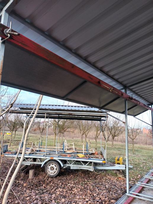 Prikolica ima fiksni krov i nadstrešnice koje se sklapaju prilikom selidbe.