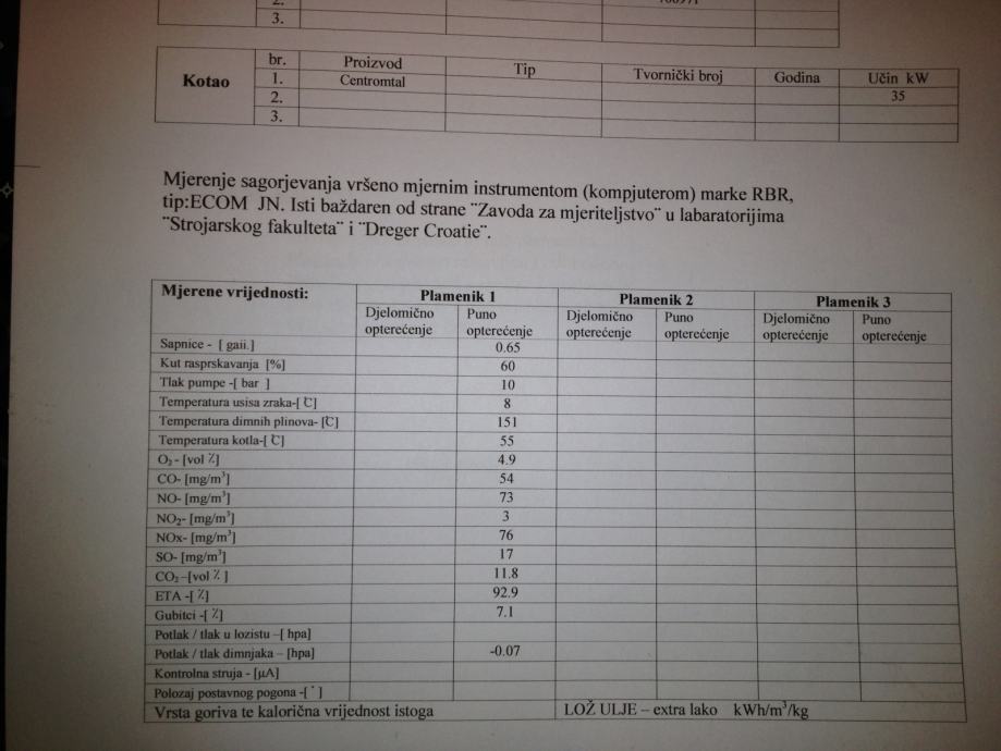 Sve komponente su redovno odrzavane i ciscene, plamenik zadnji put u sijecnju 2013 (na slici mjerene vrijednosti).