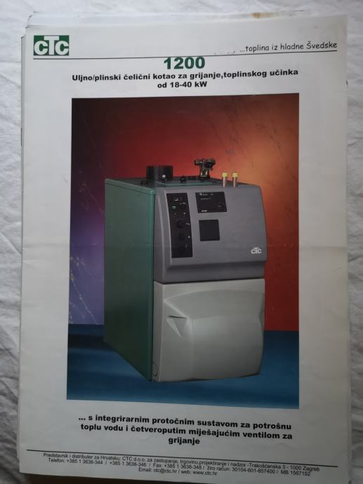 Povoljno prodajemo uljno/plinski čelični kotao za grijanje (lož ulje ili plin), snage 40 kW (ima ugrađeno svih 9 turbinatora), vrhunske švedske tvrtke CTC (inače daju 10 godina garancije). Uz peć ide i original CTC plamenik B 20 KA, a peć ima u sebi protočni bojler od 300 litara vode. Kupljena je i stavljena u pogon 2004. godine, imamo original račun i uputstvo za montažu i upotrebu. Cijena novog kompleta bila je cca 5 mojih mjesečnih plaća, dakle današnji ekvivalent više od 12.000 eura. Od prvog dana do danas, dakle više od 20 godina, besprijekorno je u funkciji, uz redovan servis svake 3-4 godine (injektori, podešavanje paljenja, čišćenje dimovoda). Iskoristivost po dim-testu 92% !!