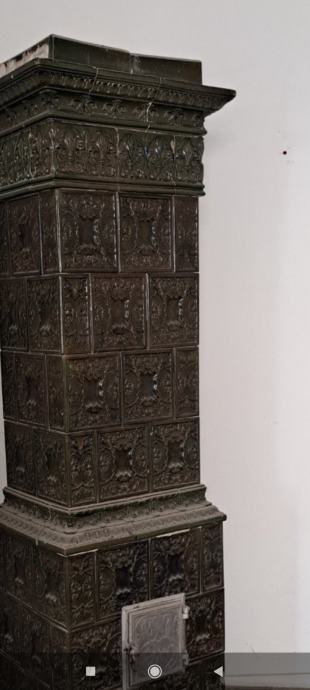 Peć je serijski rađena u srednjoeuropskim (bečkim / češkim) radionicama, s bogato reljefnim kaljevim pločicama i originalnom tamno maslinasto-zelenom glazurom. Stupaste je forme, s dekorativnom krunom i originalnim metalnim vratima.