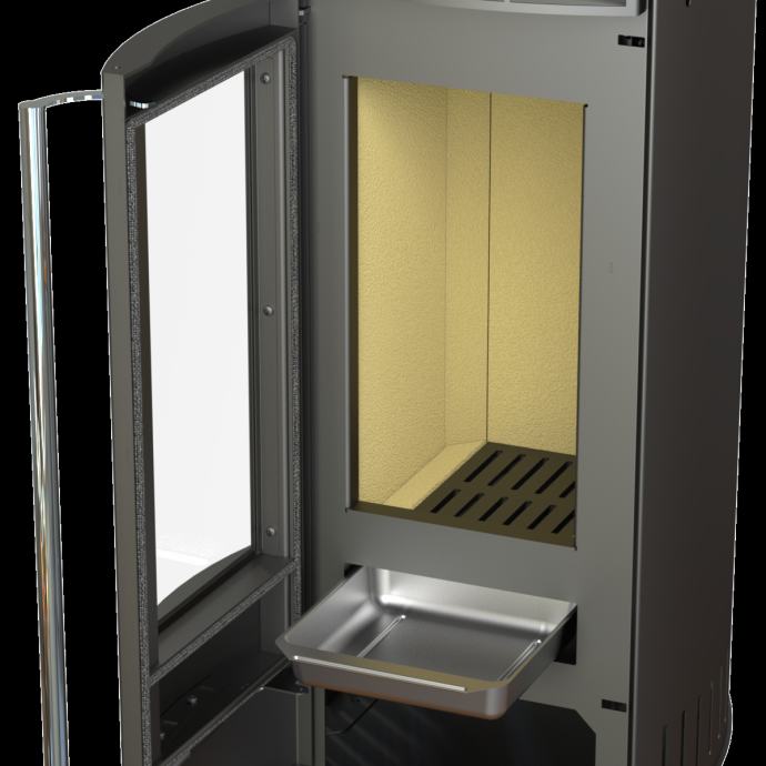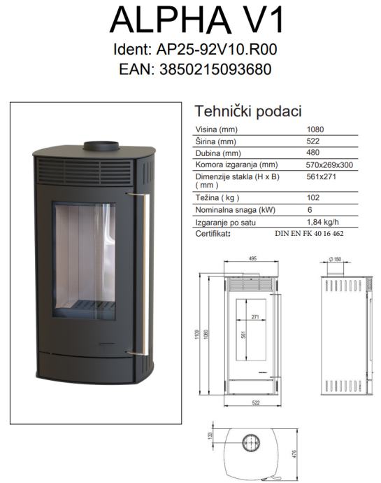 Kaminska peć Thermia Alpha V1 klasičnog je dizajna sa velikim ložištem, nominalna snaga 6 kW.