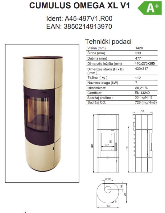 Kaminska peć Thermia Cumulus Omega XL V1 model je moderne klasike za svaki prostor, zaobljenog stakla sa automatskim regulatorom topline, nominalna snaga 7 kW.