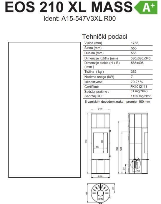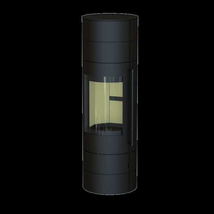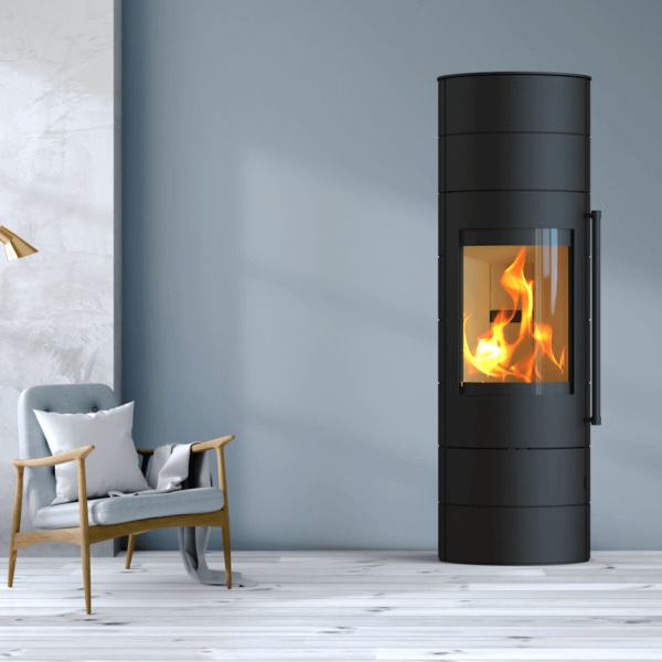 Kaminska peć Thermia Eon 210 XL Ring modernog dizajna sa panoramskim staklom, sa drvenim pretincem s zasebnim vratima, nominalna snaga 7 kW.