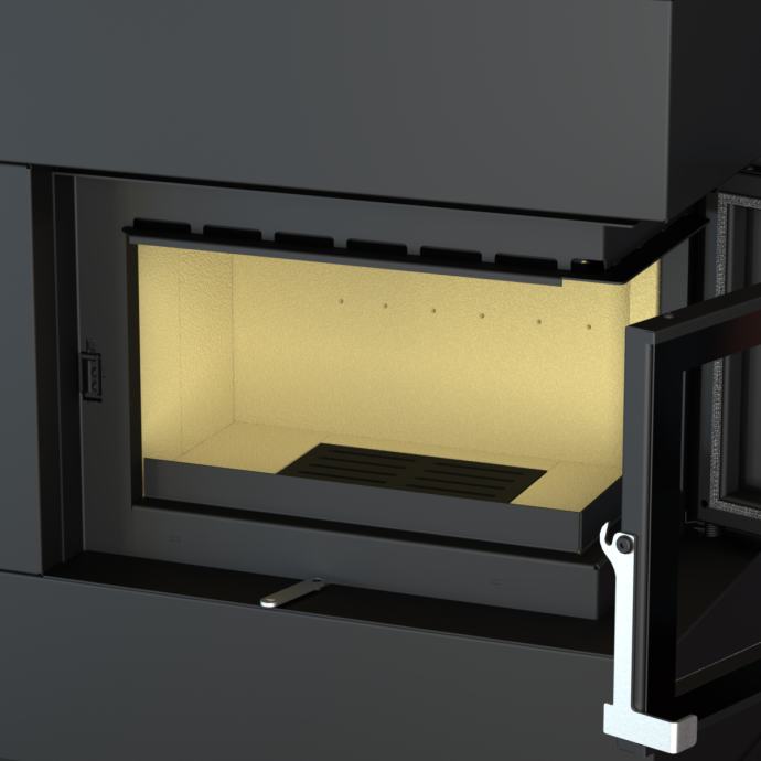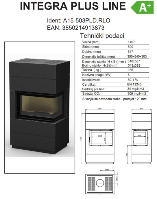 Kaminska peć Thermia Integra Plus Line samostojeća je jedinica sa obloženim kaminskim uloškom, otpornost ložišta na više od 1000 °C, nominalna snaga 8 kW.