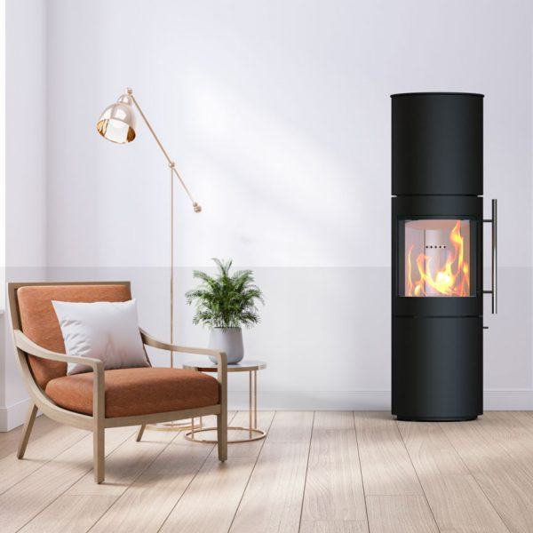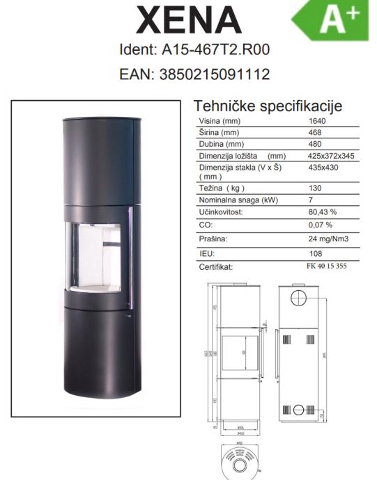 Kaminska peć Thermia Xena sa staklenim otvorom od 160 °, dizajnirani panoramski prozor, spremnik za drva sa odvojenim vratima, nominalna snaga 7 kW.