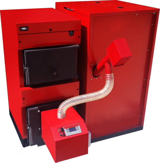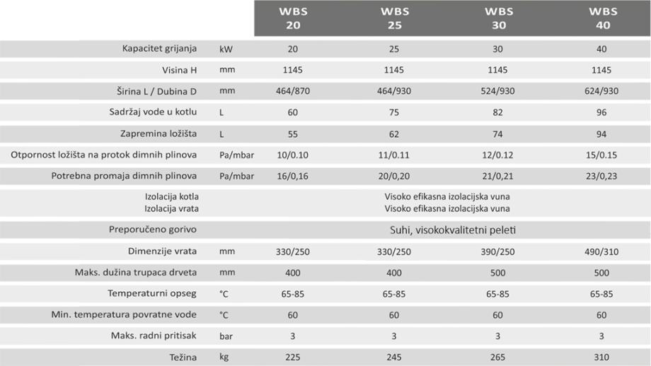 Čelični kotlovi WBS snage od 20 do 45kW, s ugrađenim plamenikom na pelete, namijenjeni su za grijanje srednjih i velikih prostora. Ložište ima veliku površinu za prijenos topline. Automatizirani plamenik na pelete i veliki spremnik brinu se za neometano loženje tijekom duljeg razdoblja. Velika vrata i ložište omogućavaju jednostavno čišćenje i održavanje. Odgovarajuće ložište te vođenje plinova izgaranja u tri prolaza osiguravaju visoki stupanj iskoristivosti kotla. Kombinacija na drva i pelete. NIje potrebno skidati plamenik već ložišta mogu raditi paralelno.