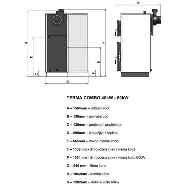 D: 105 cm, Š: 99 cm, V: 154 cm, promjer dimovoda: 120 mm, zapremina pelet spremnika: 250 l
