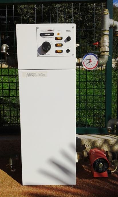 Sustav za centralno grijanje i toplu vodu na struju, Peć TERMO EKSTRA 15 kW, pumpa Grundfos UPS 25-50 130 s mjeračem pritiska i temperature. Vrlo malo upotrebljavano, služilo je samo kao zamjenski sustav za grijanje na naftu u slučaju kvara ili slično.