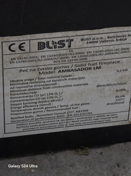 - uz peć ide i dimovodna cijev s koljenom dimenzije 70 cm i promjera 12 cm