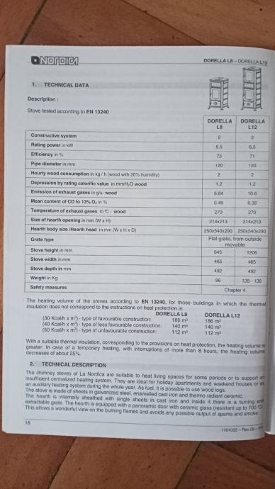 Peć na drva Nordica Dorella L8,gus,korištena 3 sezone,ispravna,bez oštećenja,tehničke karakteristike na slici,ne dostavljam.