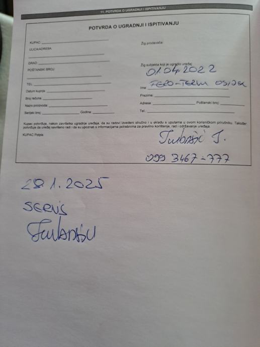 - Potvrda o ugradnji i ispitivanju