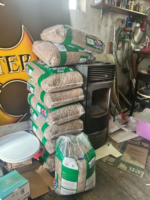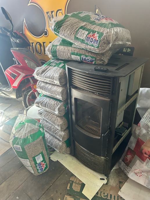 Prodajem peć na pelete zajedno s većom količinom peleta marke More. Peć je tamne boje, stajaćeg tipa sa staklenim vratašcima, standardnih dimenzija kakve se uobičajeno koriste za grijanje stambenih prostora. Uz peć dolazi nekoliko vreća peleta od po 15 kg, ukupno desetak vreća koje su vidljive uz peć. Jačina je 10kW