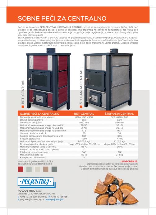 Sobne peći za centralno grijanje "Beti Central" i Štefanija Central" koriste se za zagrijavanje prostora. Na vrata ložišta postavljeno je visoko kvalitetno vatrootporno staklo koje omogućava bolje zagrijavanje okolnog prostora, te stvara potpun ugođaj topline kojeg pruža plamen u peći.