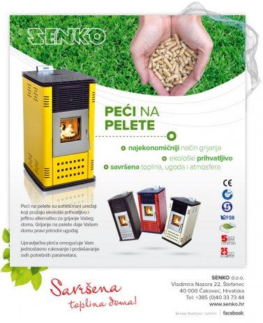 SENKO peci na pelete koriste se za grijanje stambenih prostora, a istovremeno mogu služiti i kao namještaj u svakom ambijentu. Topli zrak pomocu ventilatora izlazi iz peci u prostoriju kroz specijalne rešetke na prednjoj strani peci. Drugim ventilatorom dovodi se primarni zrak u ložište, a dimni plinovi se istodobno odvode iz ložišta u dimnjak. Doziranje peleta u ložište je automatski i programirano s elektronskim sklopom pomocu pužnog dozatora.