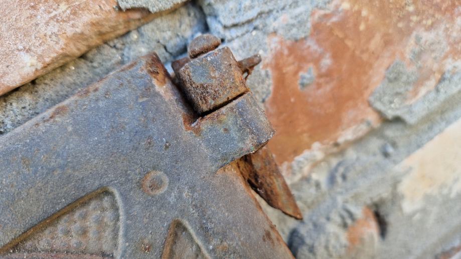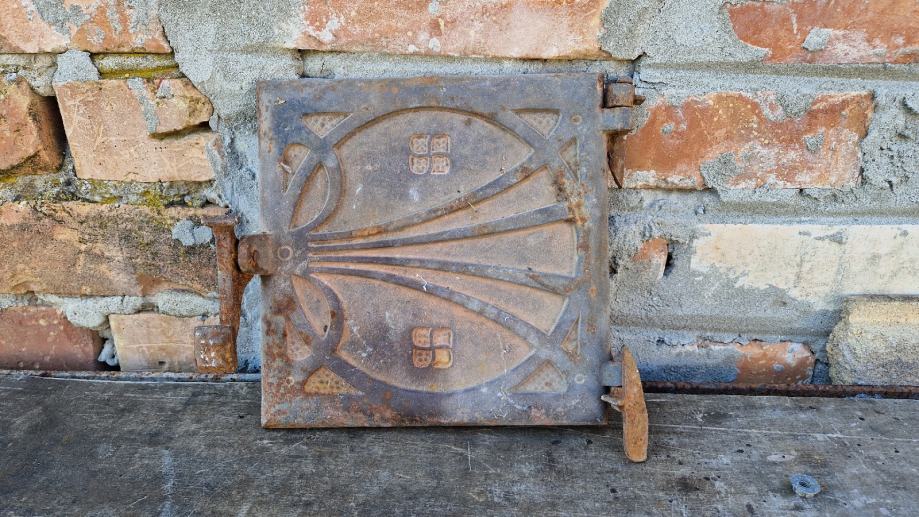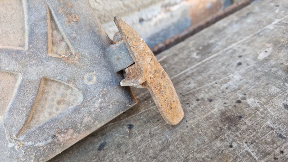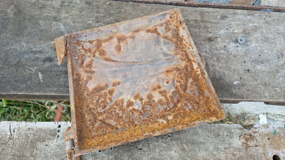 Dimenzija 21x21cm. Masivna i čvrsta. Sistem za zatvaranje je gore kao i šarke.