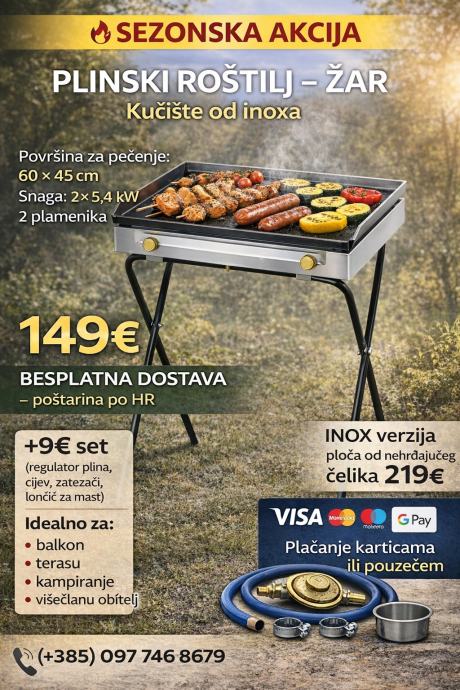 Prodajem nove plinske roštilje – žar dimenzije 60 × 45 cm, idealan za brzo i jednostavno pečenje na balkonu, terasi, u dvorištu ili na kampiranju.
