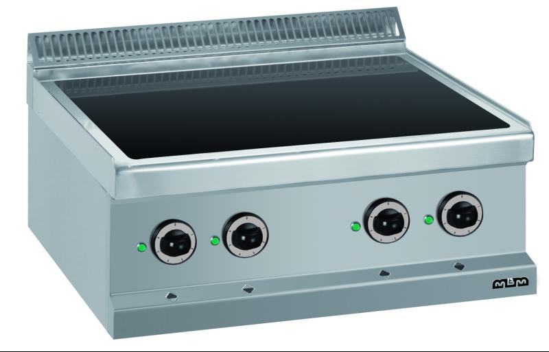 Model MG7EVC477 opremljen je s četiri neovisno upravljane keramičke električne ploče, idealan za profesionalne kuhinje koje zahtijevaju učinkovitost i lakoću održavanja.