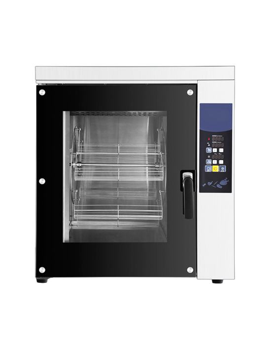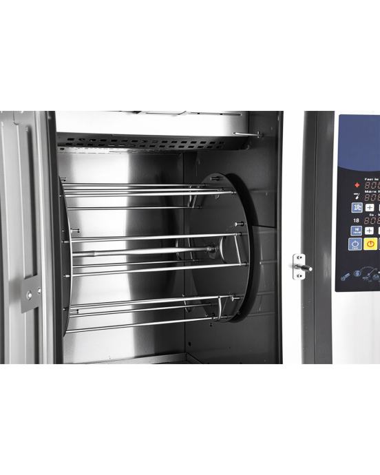 Ital Form SSG-10 je profesionalni gril visokog učinka, dizajniran za brzo i efikasno pečenje u zahtevnim ugostiteljskim objektima. Ovaj model omogućava istovremeno pečenje do petnaest pilića prosečne težine od jedan zarez pet kilograma, a ceo proces pripreme se završava za samo dvadeset pet minuta. Specifičnost ovog uređaja je kombinacija pet rotirajućih korpi i pet ražnjeva (viljuški), što ga čini idealnim ne samo za cela pilića, već i za pileće batake, svinjsko pečenje ili povrće. Izrađen je od nerđajućeg čelika sa preciznom kontrolom temperature, pružajući vrhunsku hrskavost i sočnost proizvoda uz maksimalnu uštedu vremena
