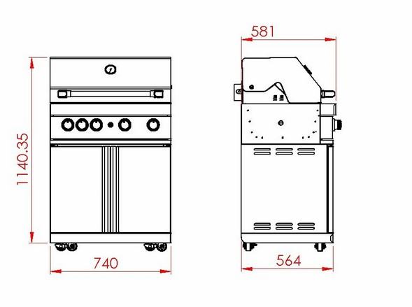 Dimenzije (širina x visina x dubina): 74 x 118 x 58 cm (dubina sa sklopljenom poklopcem za roštilj: 71,5 cm)