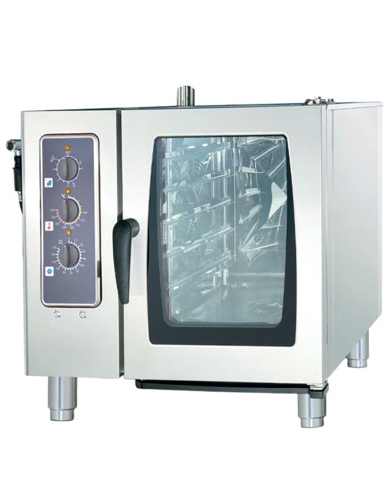 Ital Form SJ-61MAN je profesionalni konvektomat kapaciteta šest GN 1/1 posuda, dizajniran za kuvare koji zahtevaju potpunu kontrolu i jednostavnost korišćenja. Sa zapreminom od 100 litara i snagom od deset zarez pet kilovata, ovaj uređaj omogućava brzu i efikasnu pripremu različitih vrsta jela. Opremljen je intuitivnim mehaničkim komandama koje omogućavaju podešavanje temperature do tri stotine stepeni Celzijusa i tajmerom do sto dvadeset minuta. Robusna izrada i fokus na funkcionalnost čine model SJ-61MAN idealnim za restorane, kantine i manje hotele koji traže dugotrajan i pouzdan uređaj za svakodnevni intenzivan rad.