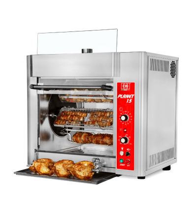 Planetarni električni uređaj za pečenje piletine na ražnju s infracrvenim grijačima za 15 pilića i 5 ražnjića u kompletu s vilicama.