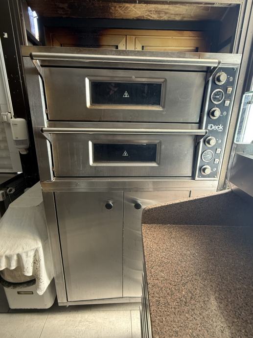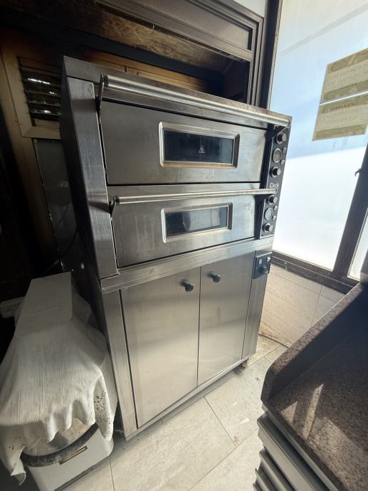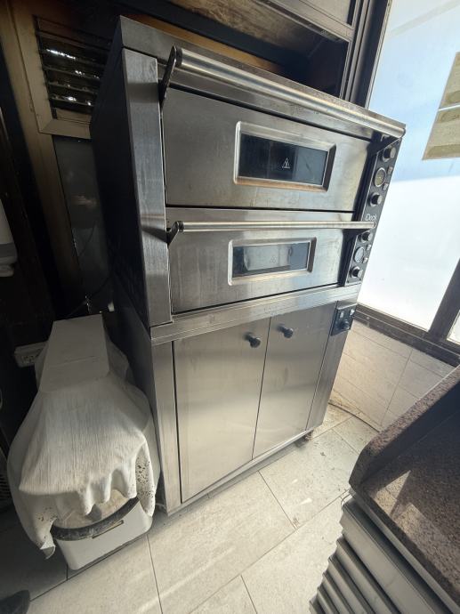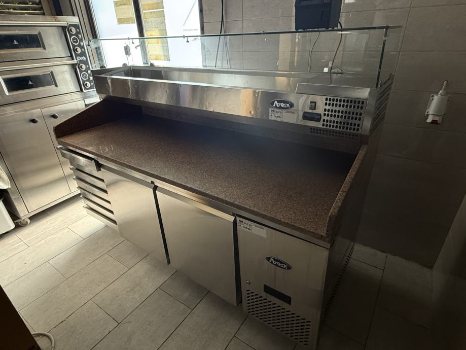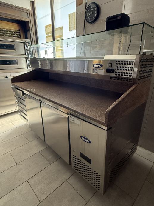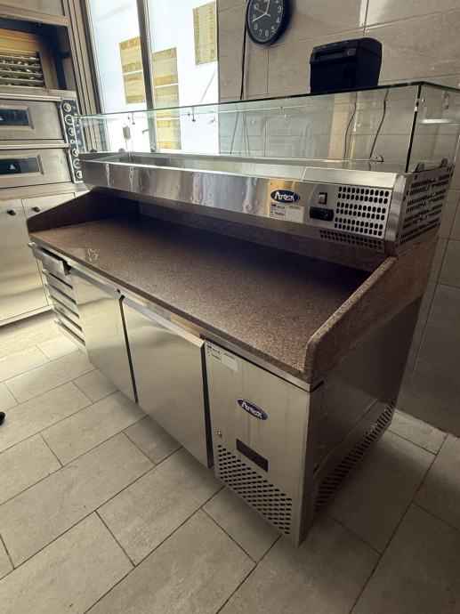 Pizza peć talijanske tvrtke Moretti sa rashladnim stolom Atosa sa prostorom za dizanje tijesta te mramornom pločom i gornje hlađenim elementom.