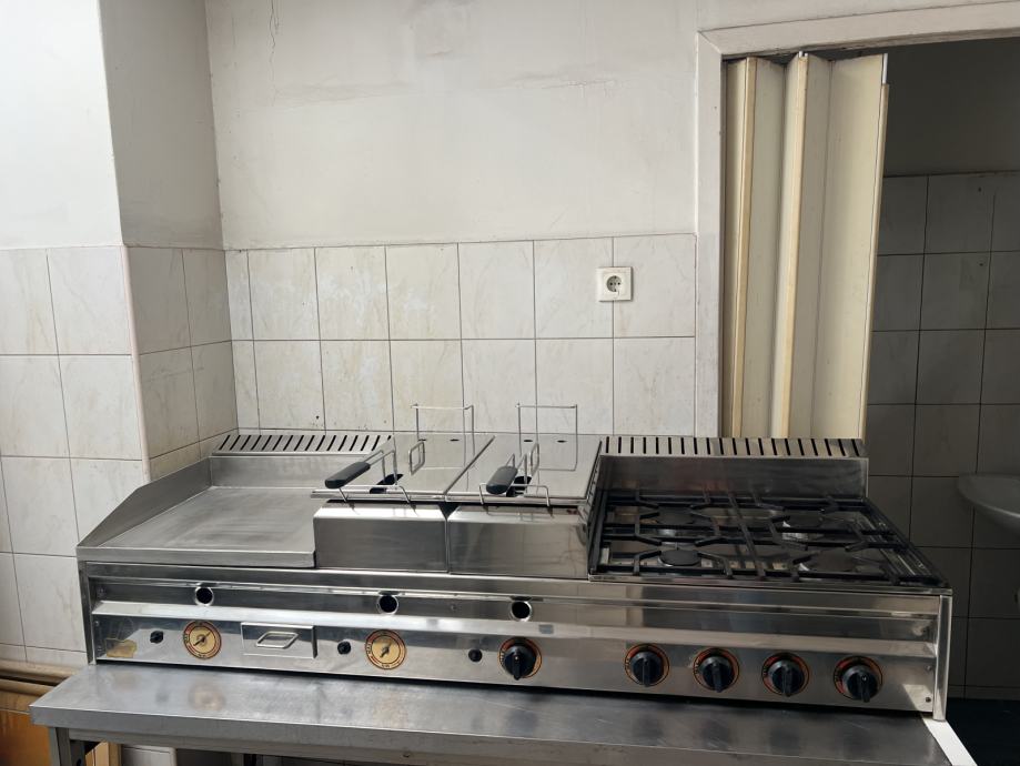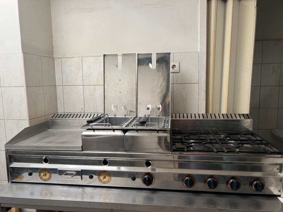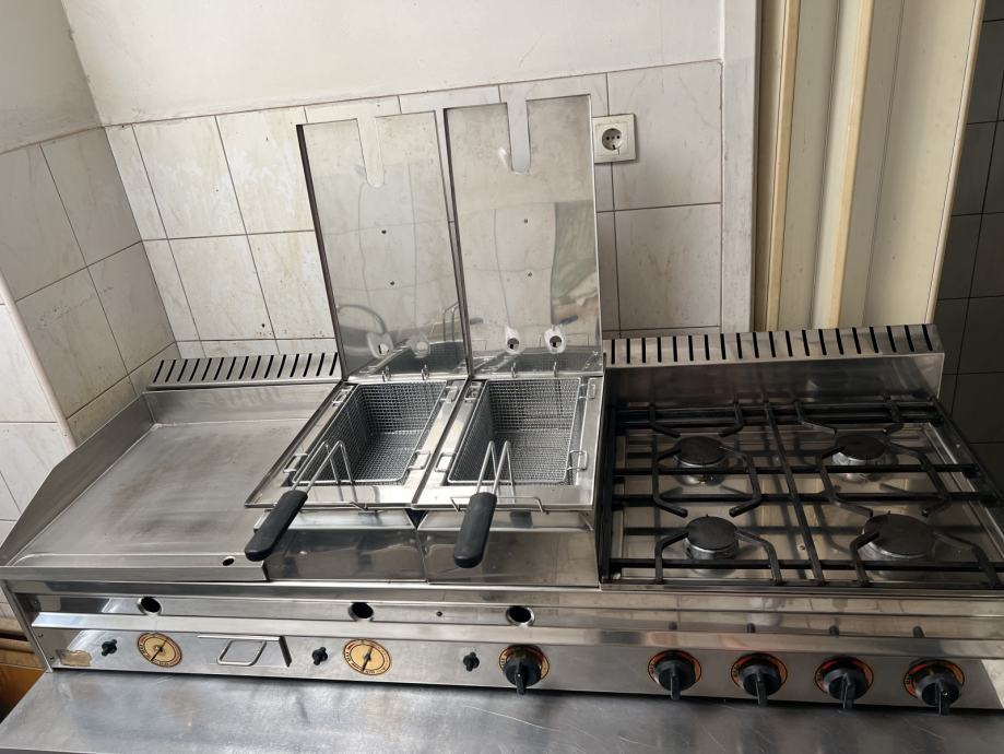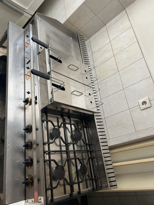 Plinska inox gastrolinija sa lijeva na desno; glatka inox ploča, dupla friteza 2x6 l, 4 kuhala