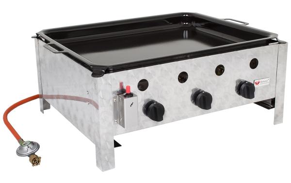 Kvalitetan plinski roštilj s emajliranom radnom površinom, idealan za pečenje mesa, kobasica i pripremu kotlovine. Dostupan kao stolni model ili s postoljem.